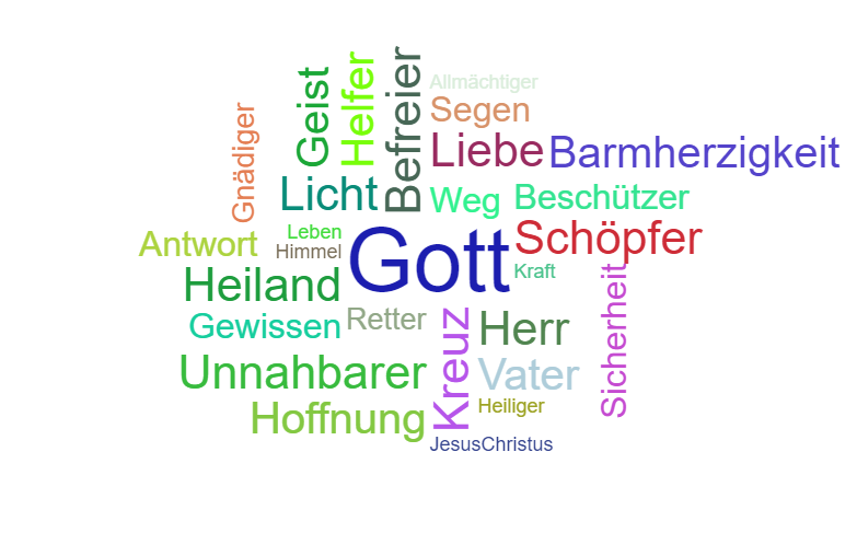 Wortwolke Gott mit Worten umschreiben Gott, Herr, Heiliger, Beschützer, Vater, Licht, Kraft, Gewissen, Helfer, Gnädiger, Kreuz, Schöpfer, Allmächtiger, Weg, Geist, Heiland, Himmel, Sicherheit, Hoffnung, Retter, Befreier, Unnahbarer, JesusChristus, Segen, Barmherzigkeit, Liebe, Leben, Antwort, , |